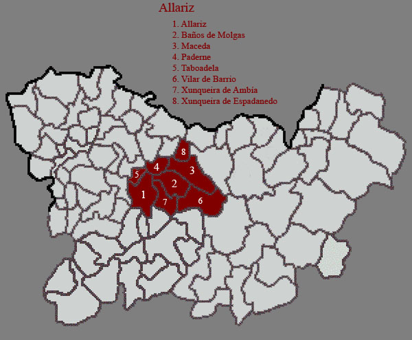 Allariz (Santiago)  Allariz (Santo Estevo)  Augas Santas (Santa Mariña)  Coedo (Santiago)  Folgoso (Santiago)  Meire (Santa María)  Os Espiñeiros (San Breixo)  Queiroás (San Breixo)  Requeixo de Valverde (Santa María)  San Mamede de Urrós (San Mamede)  San Martiño de Pazó (San Martiño)  San Trocado (San Trocado)  San Vitoiro da Mezquita (San Vitoiro)  Santa Baia de Urrós (Santa Baia)  Seoane (San Xoán)  Torneiros (San Miguel)