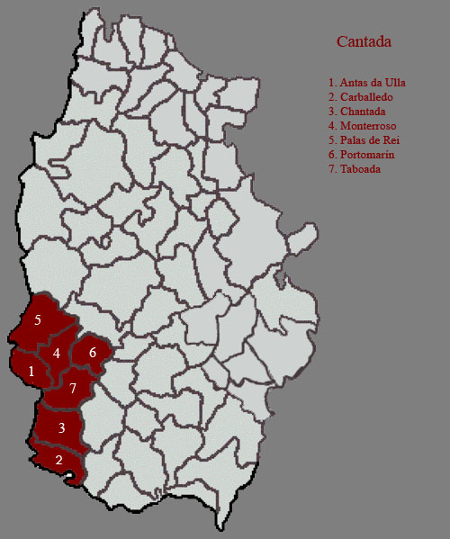 Adá (Santa Baia)  Arcos (Santa María)  Argozón (San Vicente)  Belesar (San Bartolomeu)  Bermún (Santa María)  Brigos (San Salvador)  Camporramiro (Santa María)  Chantada (Santa Mariña)  Esmeriz (Santa Mariña)  Esmoriz (San Xillao)  Fornas (San Cristovo)  Grade, A (San Vicente)  Laxe, A (San Xoán)  Líncora (San Pedro)  Mariz (San Martiño)  Mato, O (San Xillao)  Merlán (San Tomé)  Monte, O (San Miguel)  Mouricios (San Cristovo)  Muradelle (San Paio)  Nogueira de Miño (Santa María)  Pedrafita (Santa Baia)  Pereira (San Mamede)  Pesqueiras (Santa María)  Requeixo (Santiago)  Sabadelle (Santa María)  San Fiz de Asma (San Fiz)  San Pedro de Viana (San Pedro)  San Salvador de Asma (San Salvador)  San Xurxo de Asma (San Xurxo)  Santa Cruz de Viana (Santa Cruz)  Santa Uxía de Asma (Santa Uxía)  Santiago de Arriba (Santiago)  Sariña, A (San Vicente)  Veiga (San Xoán)  Vilaúxe (San Salvador)