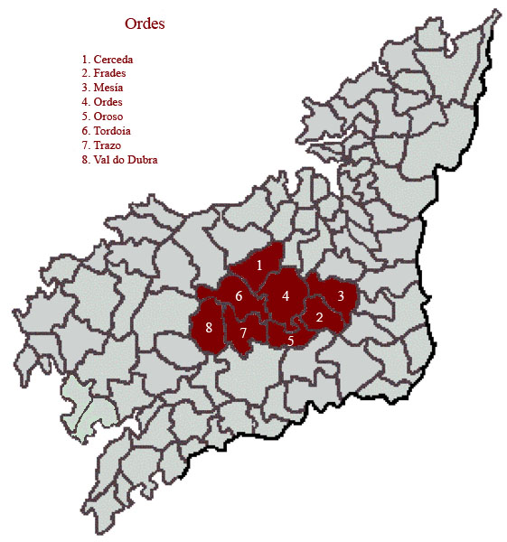 Ardemil (San Pedro) Barbeiros (Santa María) Beán (Santa María) Buscás (San Paio) Leira (Santa María) Lesta (Santo André) Mercurín (San Clemente) Ordes (Santa María) Parada (Santa Mariña) Pereira (Santaia) Poulo (San Xulián) Santa Cruz de Montaos (Santa Cruz) Vilamaior (Santiago)