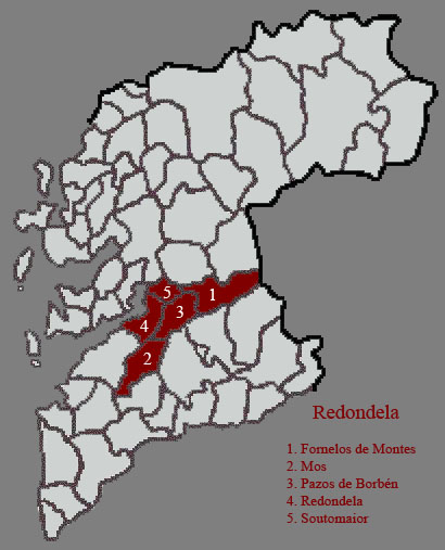 Calvos (Santo Adrián) Estacas, As (Santa María) Fornelos de Montes (San Lourenzo) Laxe, A (San Xosé) Oitavén (San Vicente) Traspielas (Santa María) Ventín (San Miguel)