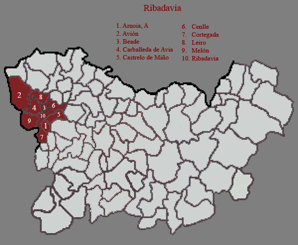 Campo Redondo (Santo André)  Esposende (Santiago)  Francelos (Santa María Madanela)  Ribadavia (San Domingos de Fóra)  Ribadavia (San Domingos)  San Cristovo de Regodeigón (San Cristovo)  Sanín (San Pedro)  Ventosela (San Paio)