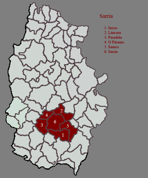 Castroncán (Santa Marta)  Estraxiz (Santiago)  Formigueiros (Santiago)  Freixo (San Silvestre)  Frollais (San Miguel)  Gundriz (Santo André)  Loureiro (Santa María)  Lousada (San Martiño)  Montán (Santa María)  Pascais (Santalla)  Reiriz (Santo Estevo)  Renche (Santiago)  Romelle (San Martiño)  Samos (Santa Xertrude)  San Cristovo de Lóuzara (San Cristovo)  San Cristovo do Real (San Cristovo)  San Mamede do Couto (San Mamede)  San Martiño do Real (San Martiño)  San Xil de Carballo (San Xil)  San Xoán de Lóuzara (San Xoán)  Santalla (San Xosé)  Suñide (Santa María)  Teibilide (San Xulián)  Zoó (Santiago)